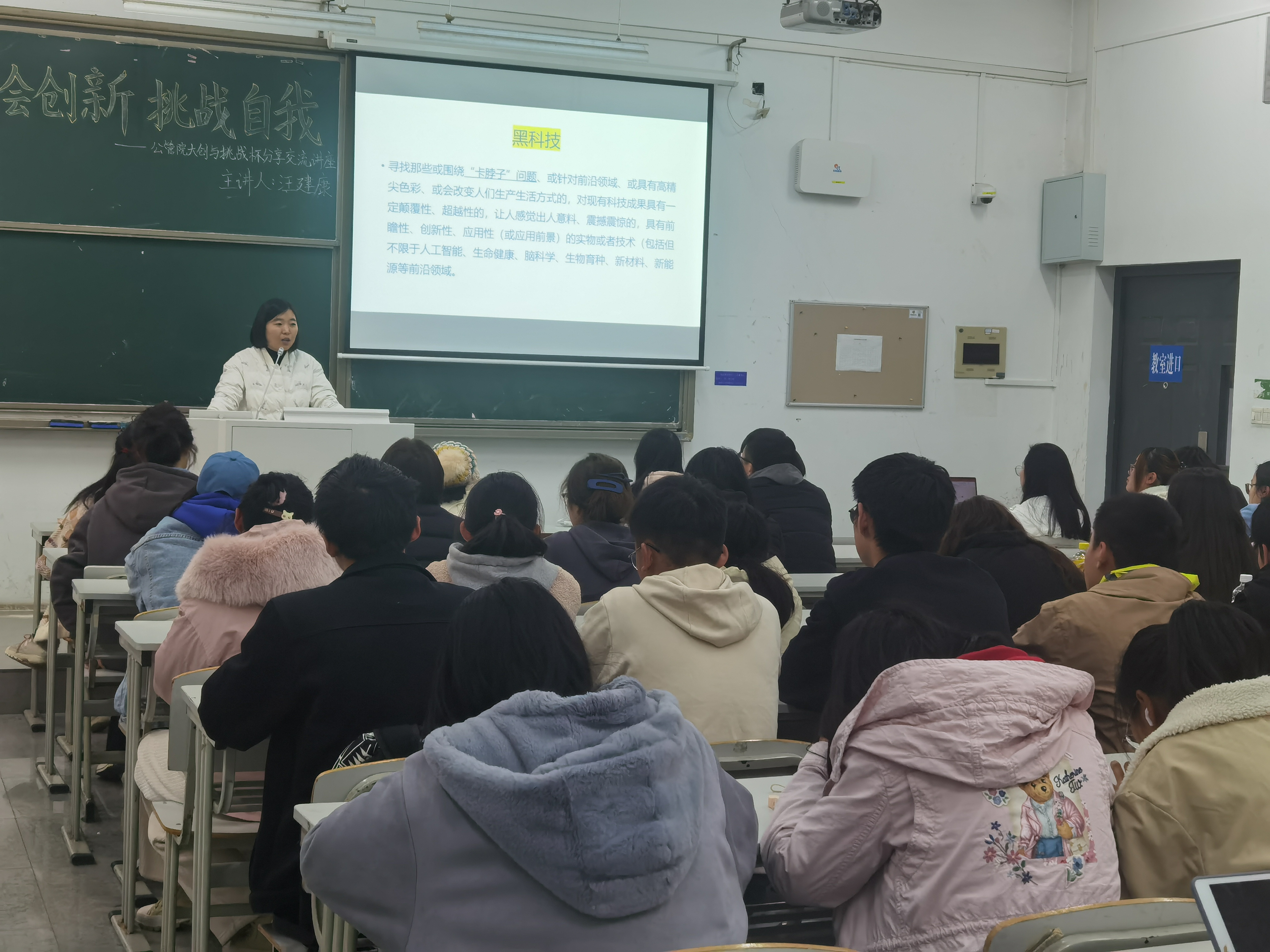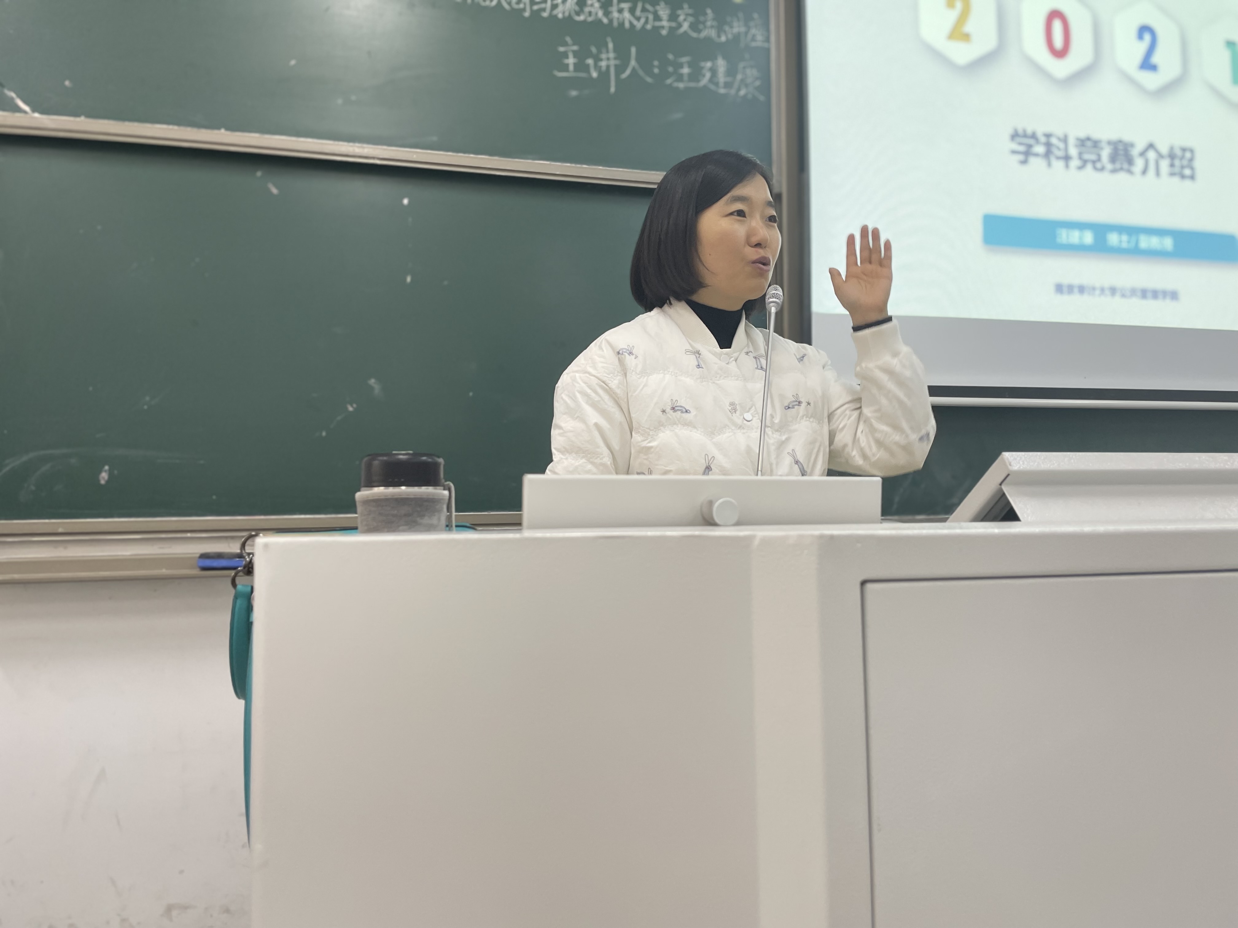 讲座开始,汪老师先进行了关于学科竞赛的大体介绍。并说明现在高校学子参与的学科竞赛主要为“挑战杯”、“创青春”以及“互联网+”大赛。汪老师主要从赛事基本情况,如时间、举办频率、历年主办方以及优秀选手团体等,以及参与项目的可研究方向等多个方面进行了全面的介绍。同时,大学生创新创业训练项目也受到高校学生的极大关注,汪老师也提出了许多宝贵观点和建议。从大创项目的申报格式到申报注意事项,再到社会调研的方法,多方面让学生们对于大创有了更深入的了解。