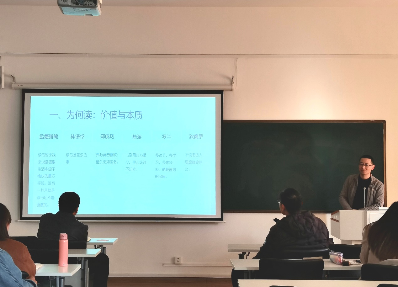 袁建军副教授形象地将阅读比作是“采得百花成蜜后,为谁辛苦为谁甜”的过程,肯定了阅读能够满足好奇、追求幸福的重要价值。在当今时代背景下,大家接触的多为碎片化知识,而阅读是一个完整的、系统的过程,有利于研究生知识体系的构建。最后,袁建军副教授指出,阅读好的作品不仅可以弥补自己在某一领域的知识空白,还可以提升思想高度,并再次诚恳地建议大家多阅读思想性作品。