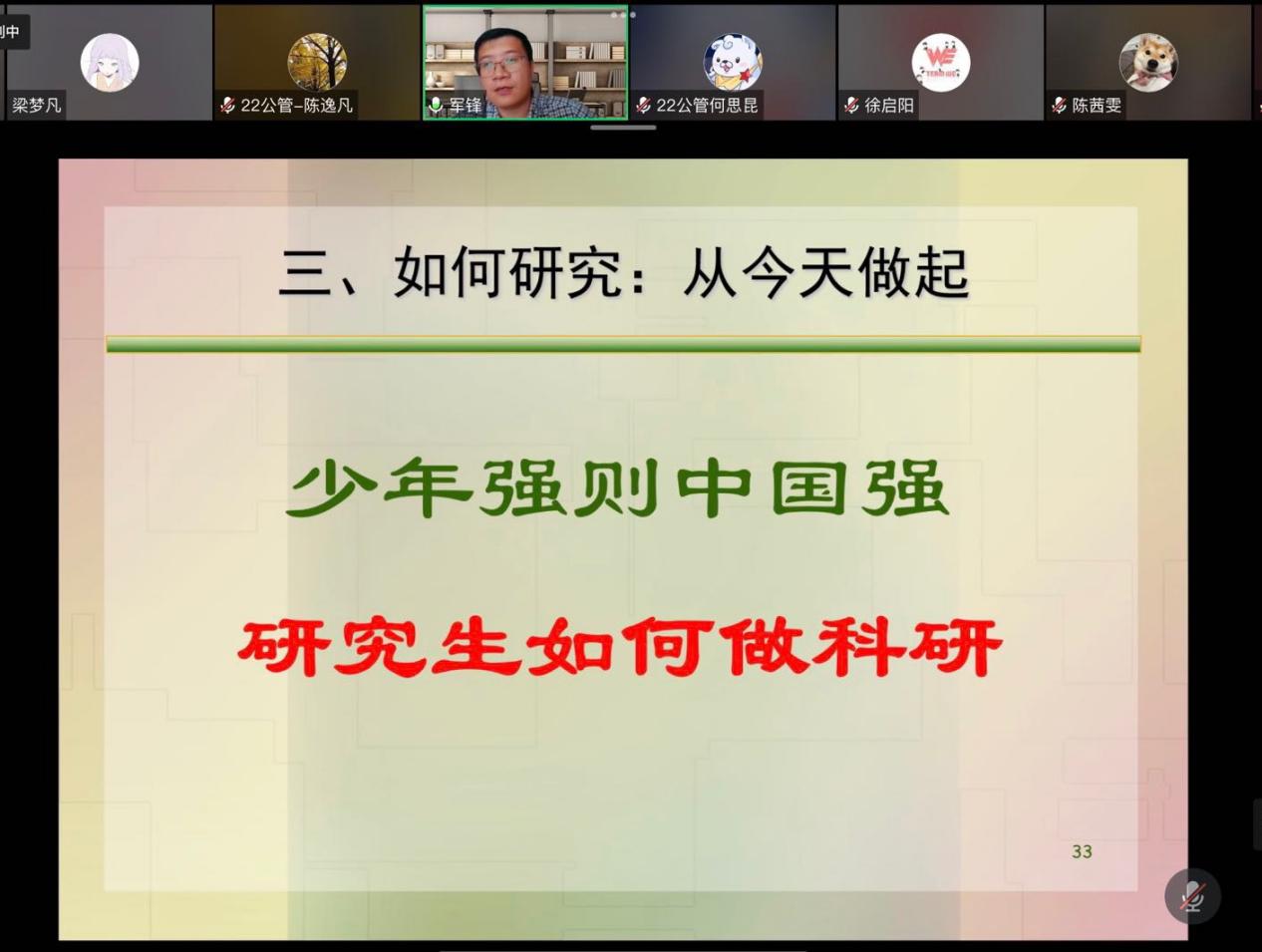 为了提升研究生的学术素养和人文素养,更好地实现立德树人的人才培养目标2022731日上午,公共管理学院2022级研究生暑期系列培训项目的第二次讲座顺利开展,讲座采用线上方式进行。成人卡通 公共管理学院副院长赵军锋教授为成人卡通 2022级研究生新生开展了题为“科学精神与科研创新”的学术讲座,旨在帮助成人卡通 研究生新生尽早进入科研状态,全面提升研究生科研素养与能力,强化学术规范和学术道德意识。