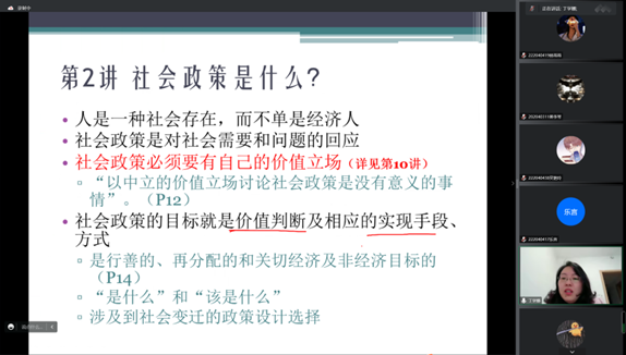 最后,丁老师将全书的内容总结为两部分:社会政策研究的领域和社会发展政策的必要性,并将我国的实际情况与本书的理念结合。在引发同学们思考的同时,也向大家展示了自己的见解。