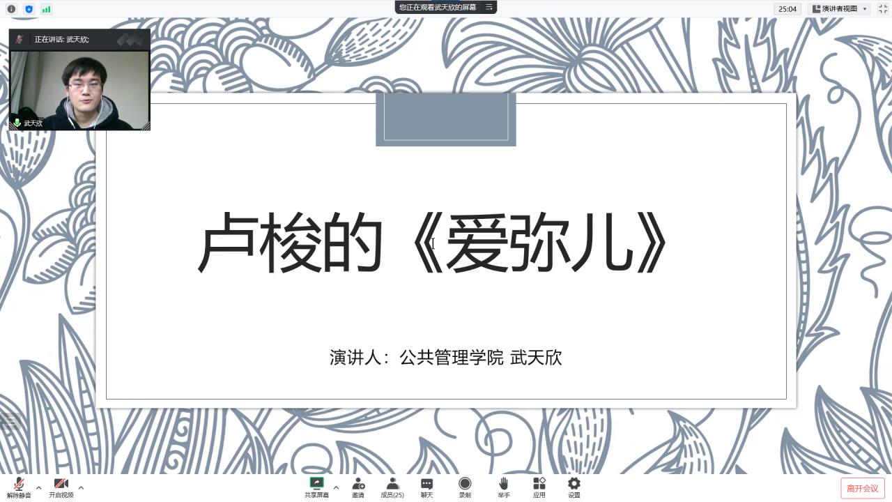 2022年11月30日下午15:00,由公共管理学院学促会举办的读书会活动以线上形式在腾讯会议顺利举行。本次读书会诚邀公共管理学院的武天欣老师同30余名来自20、21和22级的学生分享交流《爱弥儿》。