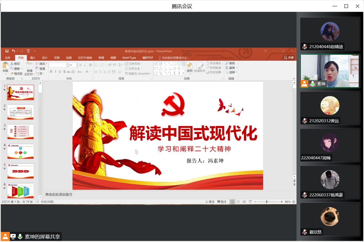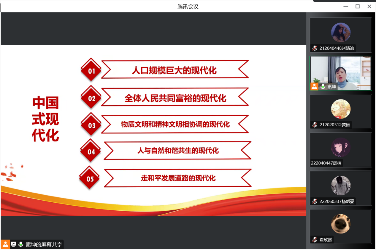 活动伊始,冯素坤老师从中共二十大报告引入,指出从现在起,中国共产党的中心任务是团结带领全国各族人民全面建成社会主义现代化强国,实现第二个百年奋斗目标,以中国式现代化全面推进中华民族伟大复兴。中国式现代化为人类实现现代化提供了新的选择,中国共产党和中国人民为解决人类面临的共同问题提供更多更好的中国智慧、中国方案、中国力量。