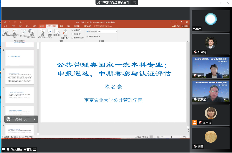 为更好开展成人卡通 行政管理、劳动与社会保障专业的国家一流专业建设工作,12月9日下午,成人卡通 邀请南京农业大学欧名豪教授面向全院教师开展了国家一流专业建设线上指导讲座。讲座由学院党委书记金晶主持。