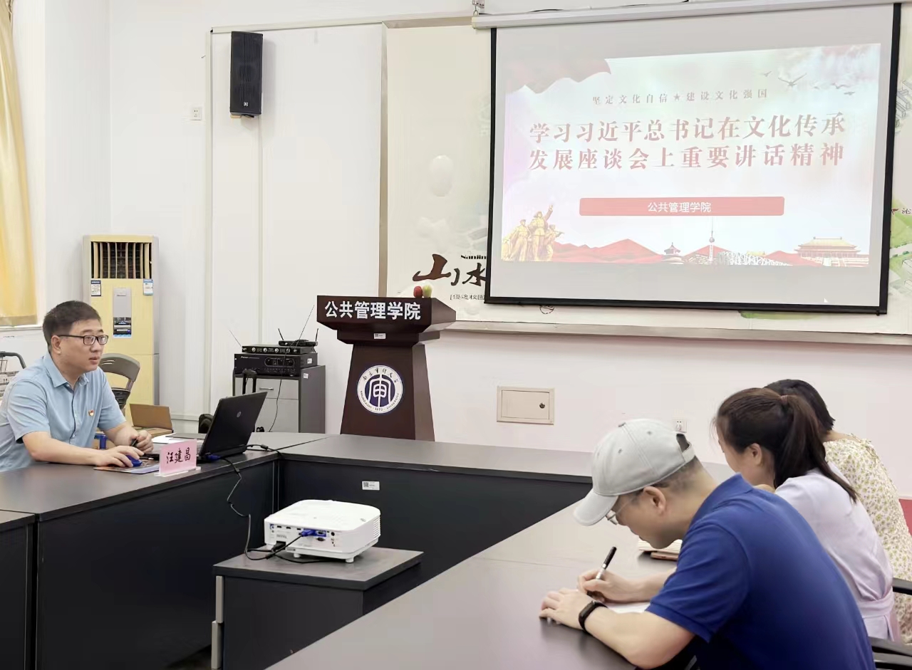 75日下午,公共管理学院党委理论学习中心组在敏达305开展专题学习会,学习习近平总书记在文化传承发展座谈会上的重要讲话精神。院党委副书记(主持)汪建昌主持会议。