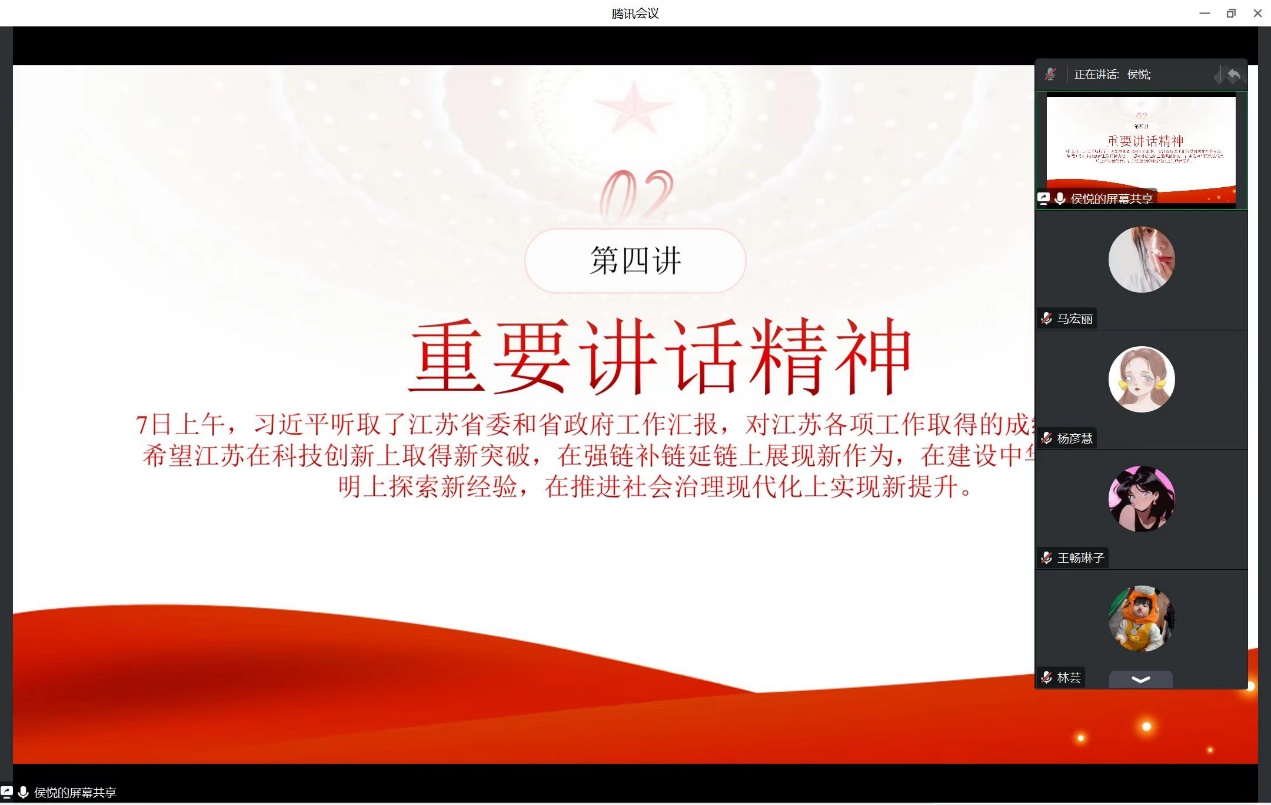 7月23-24日,由党支部支委侯悦和马宏丽领学,深刻学习了习近平总书记考察江苏重要讲话精神以及习近平总书记在二十届中共中央政治局第五次集体学习关于建设教育强国重要讲话精神。今年是全面贯彻落实党的二十大精神的开局之年,也是全面建设社会主义现代化国家新征程的起步之年。在全省深入开展学习贯彻习近平新时代中国特色社会主义思想主题教育的关键节点,习近平总书记深入江苏考察并发表重要讲话、作出重要指示,这是江苏发展历程中具有里程碑意义的大事,充分体现了总书记和党中央对江苏工作的高度重视、巨大关怀。我们要深刻领会总书记对江苏工作的肯定和勉励,进一步坚定紧跟总书记、奋进新征程的信心和决心,坚定沿着总书记指引的方向阔步前行。建设教育强国是全党全社会的共同任务。要坚持和加强党对教育工作的全面领导,不断完善党委统一领导、党政齐抓共管、部门各负其责的教育领导体制。各级党委和政府要始终坚持教育优先发展,在组织领导、发展规划、资源保障、经费投入上加大力度。学校、家庭、社会要紧密合作、同向发力,积极投身教育强国实践,共同办好教育强国事业。全党全国人民要坚定信心、久久为功,为早日实现教育强国目标而共同努力。