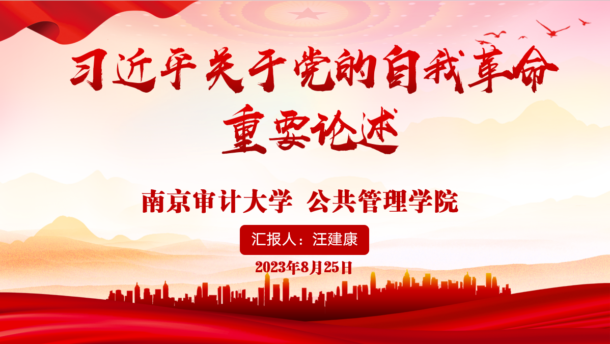 围绕“党的自我革命”这一主题,汪建康、蔡霞、王扩建、张雨暄四位老师先后讲授专题党课。汪建康全面阐释了“党的自我革命”理论的逻辑依据、内容体系、实践道路和理论贡献。蔡霞说“党的自我革命永远在路上”,并从“勇于自我革命是党的鲜明品格”“自我革命是跳出历史周期率的必然选择”“深入把握自我革命的实践要求”三个方面深刻剖析。王扩建则探索党的自我革命与国家审计效能的关系,提出要更好发挥审计在推进党的自我革命中的独特作用。张雨暄从历史的视角,结合马克思主义理论,阐释我们的党在历史实践当中自我革命的具体表现,并分享作为一个党员,一个人民教师,践行党的自我革命的体会。
