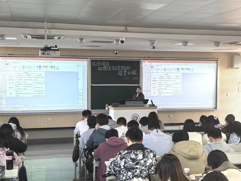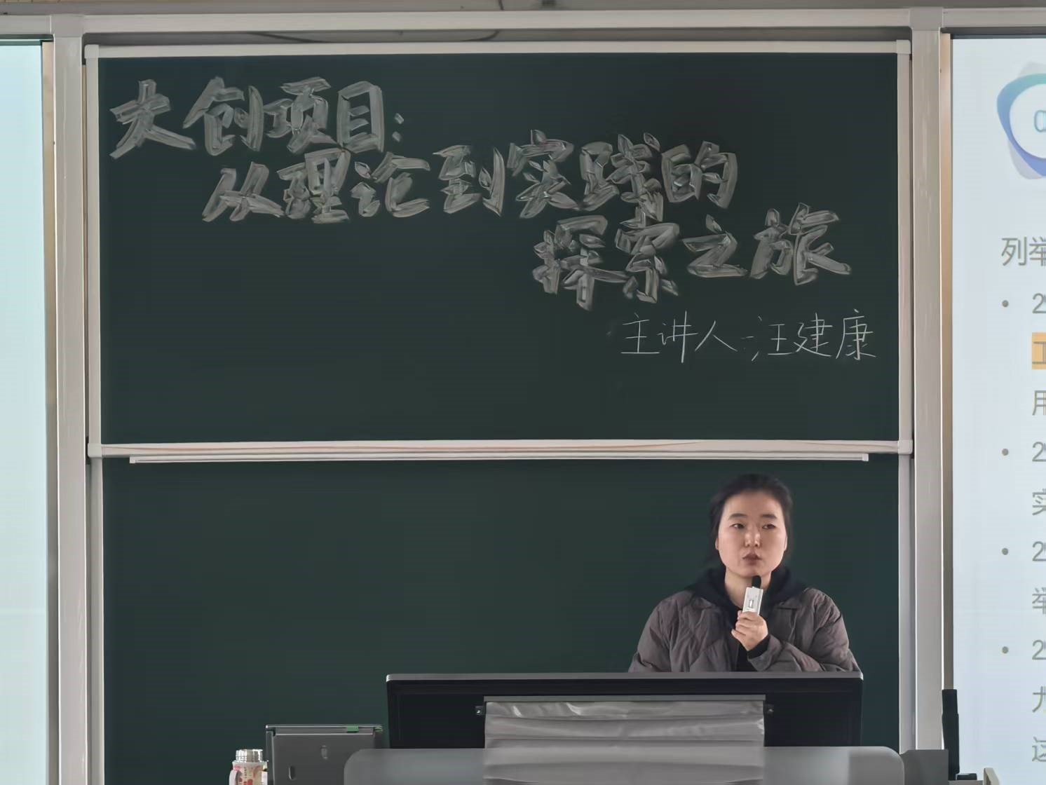 “阅读是创新的阶梯”。 汪老师着重强调,知识积累与思维拓展在创新之路上起着关键作用。她推荐了学习强国官网、大学生创新创业训练计划平台等权威资源库,指出这些平台就是一座知识宝库,汇聚海量资讯与优秀案例。汪老师还建议同学们深度钻研往届获奖项目,从中梳理出 “问题导向 - 方案设计 - 成果转化” 的完整逻辑链,顺着这条思维脉络,不断汲取经验,启发自身创新灵感 。