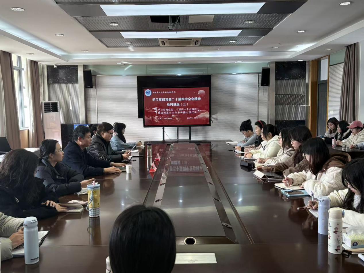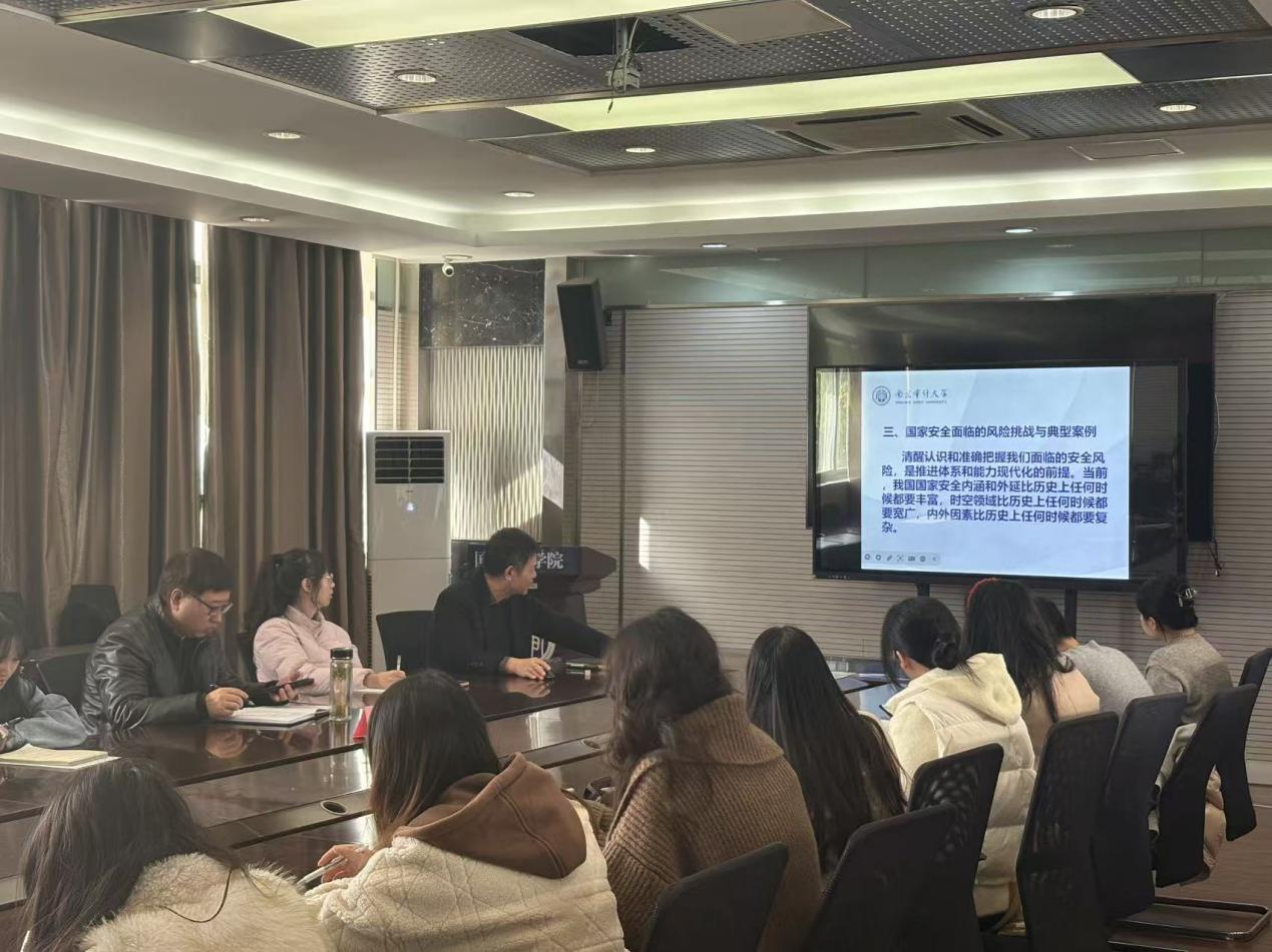 为深入学习领会党的二十届四中全会精神的丰富内涵与核心要义,2025年11月28日上午,成人卡通 在竞慧东302会议室举办了题为《学习贯彻党的二十届四中全会精神,推进国家安全体系和能力现代化》的讲座。本次讲座由陈兴发教授主讲、汪建昌教授主持,学院30余名研究生、本科生现场聆听学习。